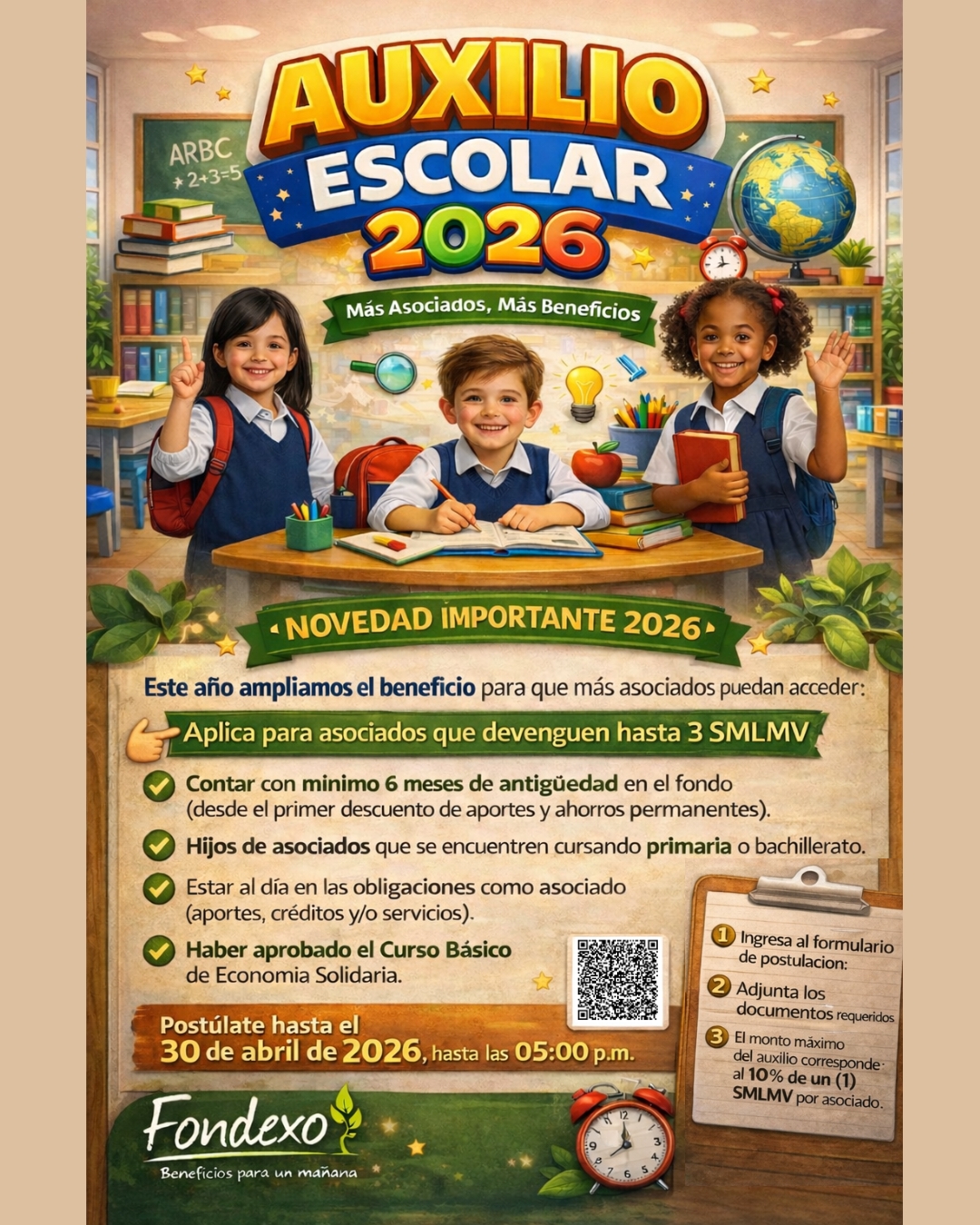 En Fondexo apoyamos la educación y el bienestar de nuestras familias mediante el Auxilio Escolar 2026, un aporte económico que contribuye al proceso formativo y académico de los hijos de nuestros asociados. 📅 Recuerda que tienes plazo hasta el 30 de abril para postularte. ¡Postúlate ya!