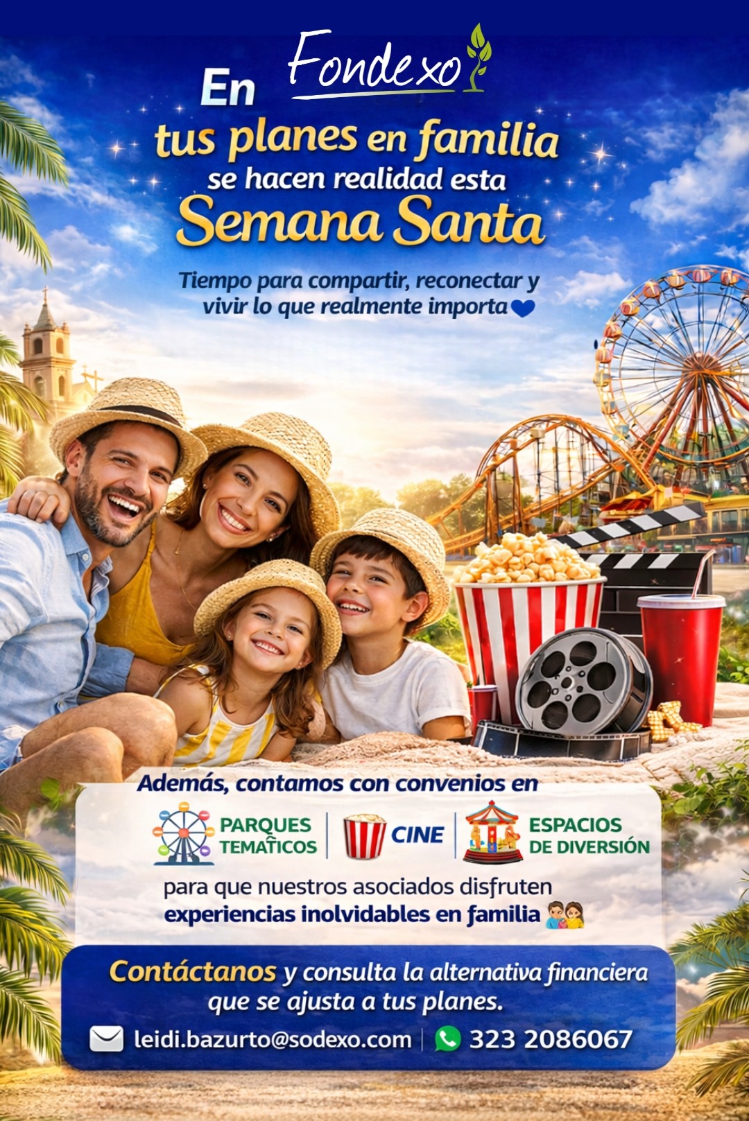 En Fondexo encuentras el apoyo que necesitas para hacer realidad tus planes en Semana Santa. Disfruta de nuestros convenios en parques temáticos, cine y espacios de diversión. Más momentos en familia, más experiencias para recordar. Descubre la alternativa financiera que mejor se ajusta a tus planes y contacta al asesor de tu ciudad Barranquilla: paula.uribe.ext@sodexo.com Bogotá: Soranlly.puentes.ext@sodexo.com Medellín: Valentina.correaciro.ext@sodexo.com Cali y eje cafetero: Carolina.diaz.ext@sodexo.com También puedes consultar en nuestro whatsapp 3232086067 o 3103028751 (provisional)