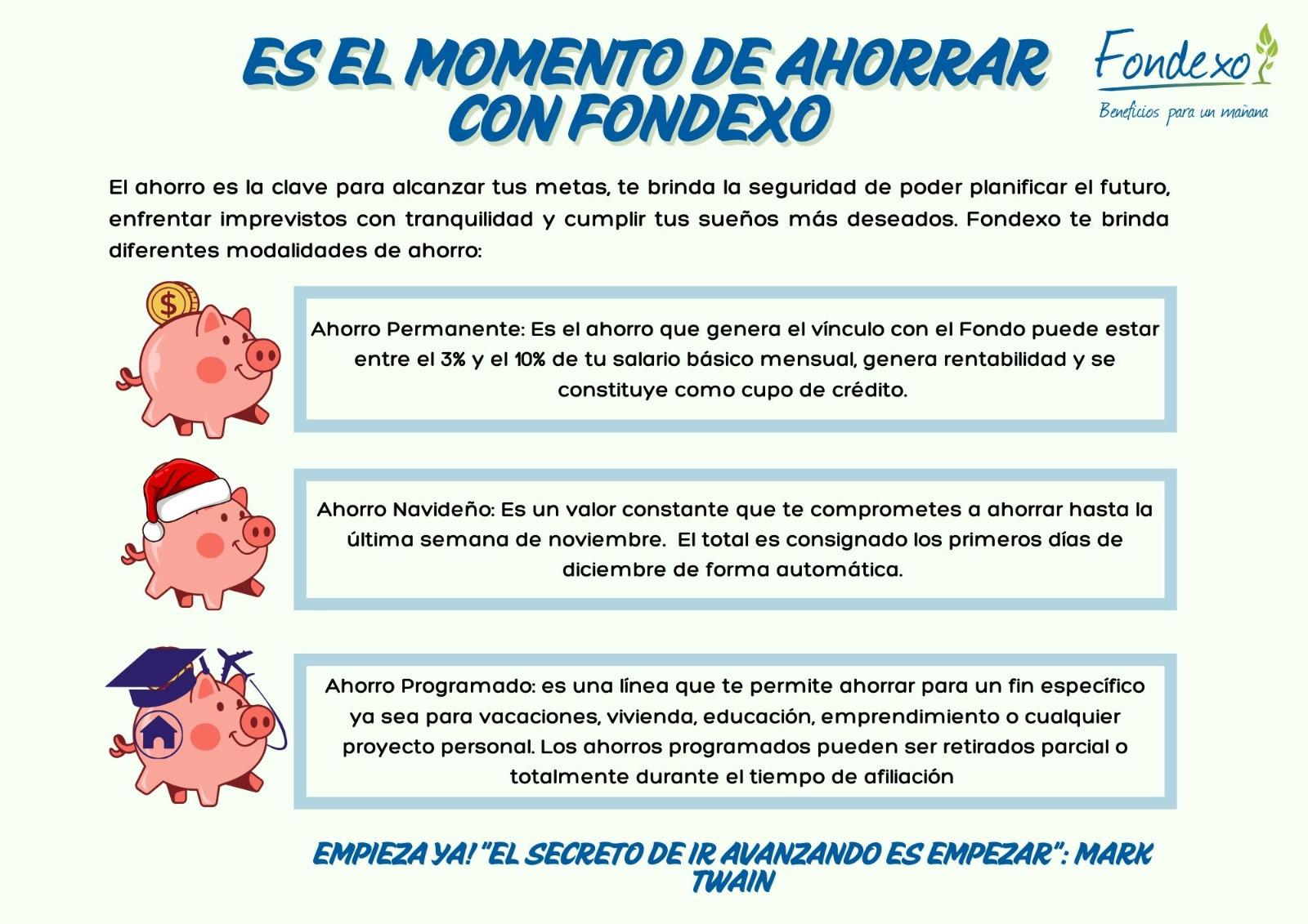 FONDEXO quiere ser su aliado para cumplir tus proyectos y el de tu familia. El ahorro será siempre una gran herramienta para planear el alcance de nuestros objetivos, enfrentar imprevistos y emergencias o disfrutar de algo que siempre hemos deseado. Para ello, tenemos diseñado para ti, diferentes alternativas de ahorro voluntarios que podrás retirar cuando lo desees, ya sea para los gastos navideños, planificar tus vacaciones familiares.
