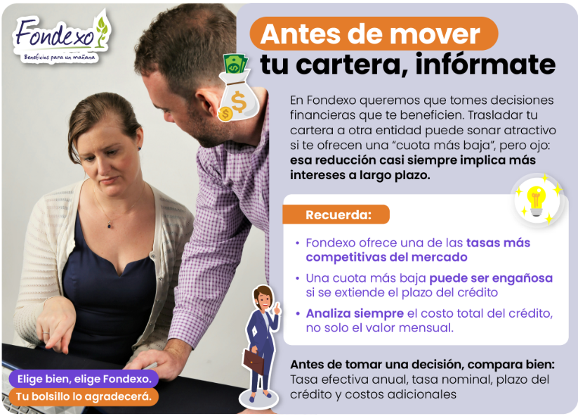 En Fondexo te orientamos para que tomes decisiones financieras seguras, inteligentes y acordes a tus necesidades. Recuerda que el afán al momento de tomar un crédito puede llevarte a pagar más intereses y afectar tu bienestar económico.