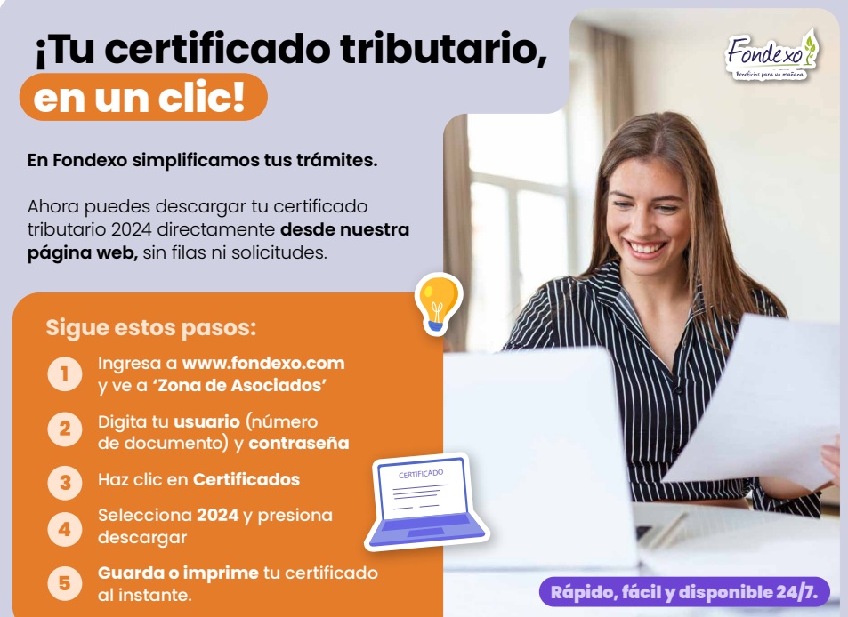 Ahora en Fondexo puedes descargar tu certificado tributario de forma rápida y sencilla. Solo ingresa a nuestra página web, accede con tus datos y obtén tu documento en pocos pasos.