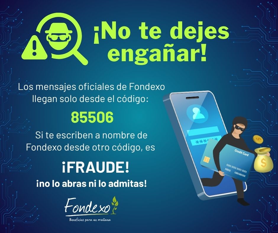 Si el mensaje de texto no es del código 85506 , no es Fondexo. Protege tus datos y no aceptes mensajes desde códigos diferentes porque podrían ser intentos de fraude.